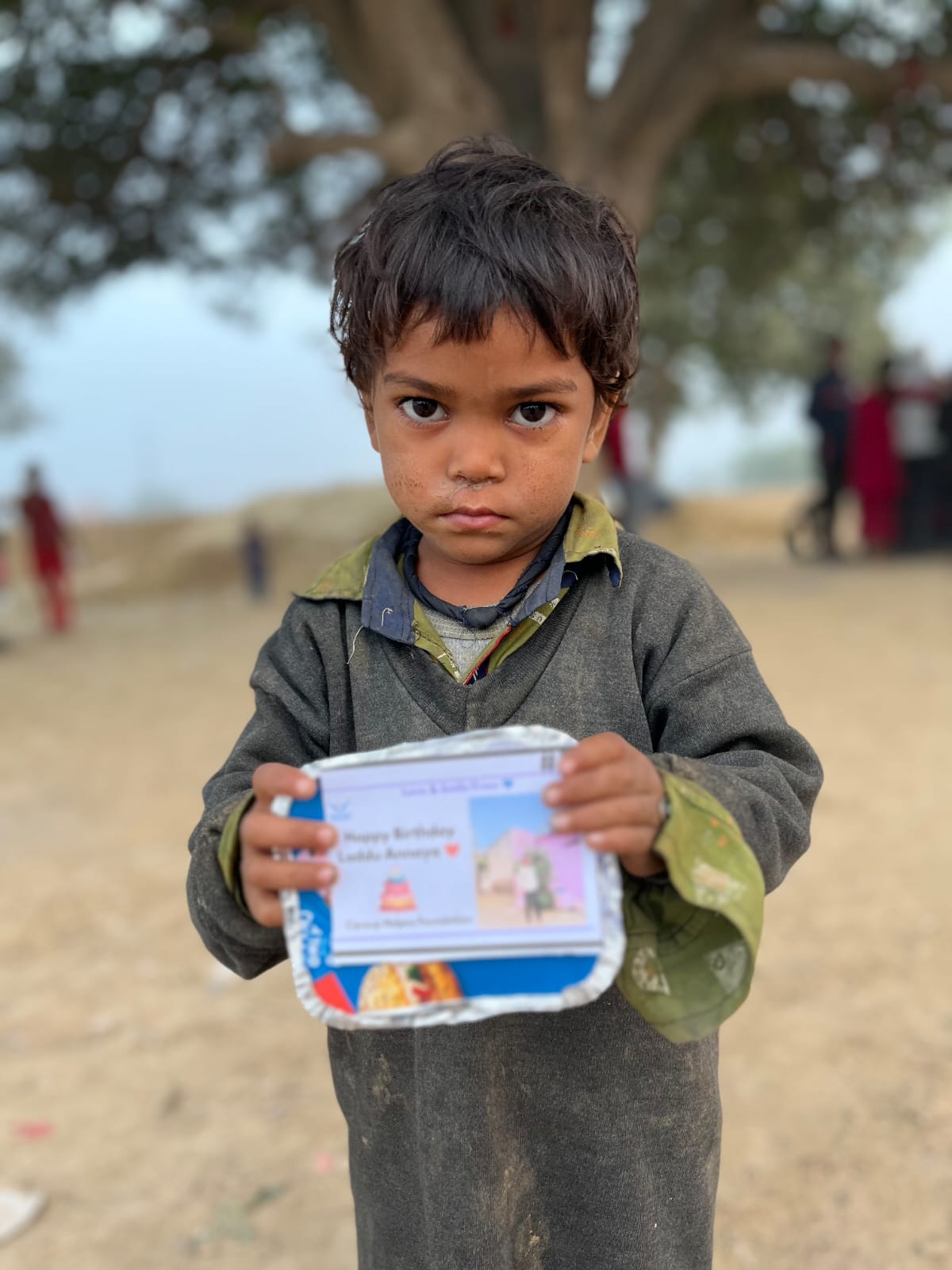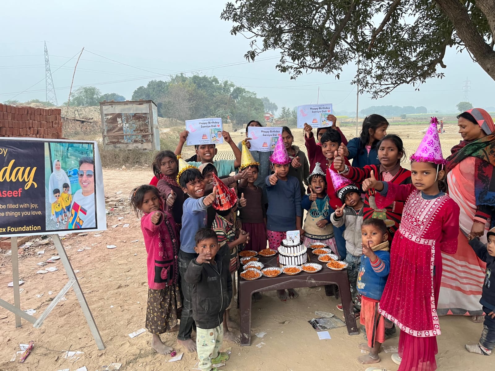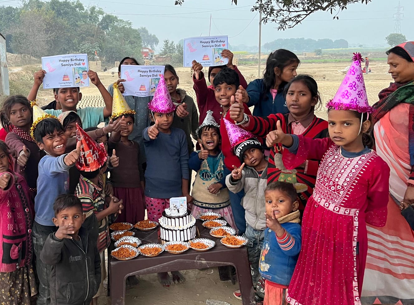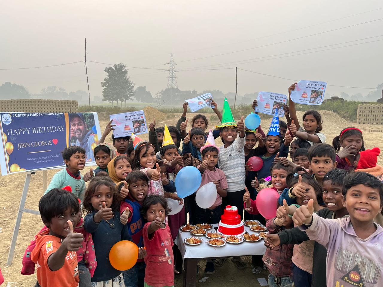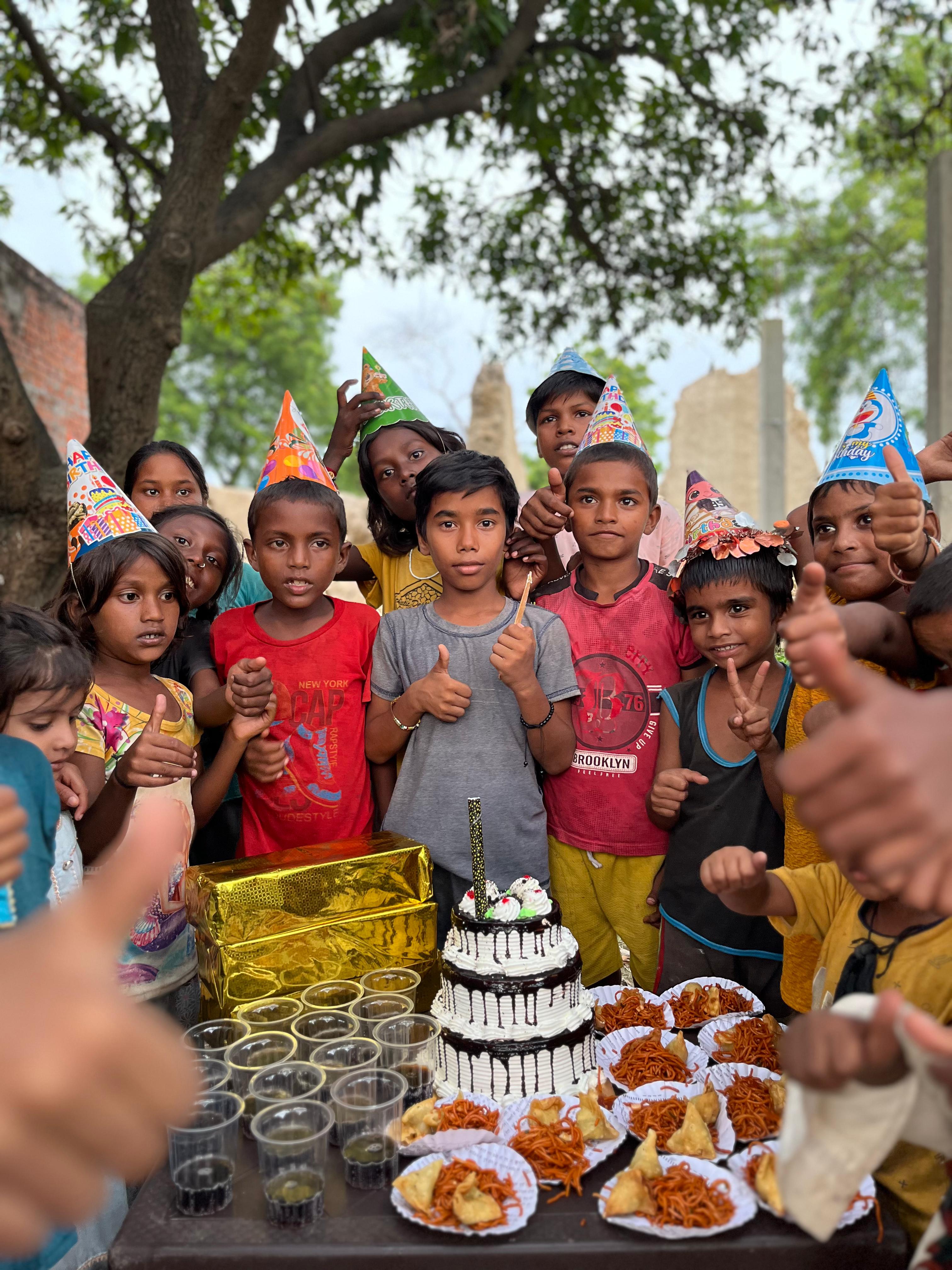 We provide 50 basic food packets full of nutrition + a well designed double layer cake for children + snacks or chocolate + Cold drink + banner + Video wishes from children + a well edited video